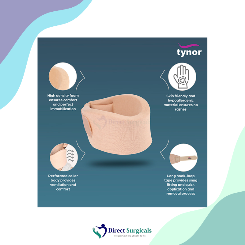 The Tynor Collar Soft (Firm Density) is an orthopedic device designed to provide moderate yet comfortable immobilization and controlled support to the cervical spine. It bridges the gap between a standard soft collar and a rigid collar, offering more effective restriction of movement due to its firm foam core. It is primarily used for the conservative treatment of moderate cervical sprains, strains, whiplash, neck stiffness, and as a gradual transition device after a rigid collar is removed.